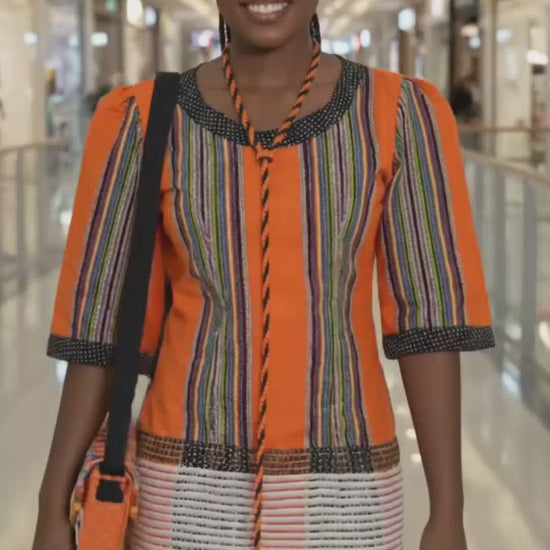 Crafted with vibrant striped patterns and striking colour combinations, each dress tells a story of heritage while remaining effortlessly wearable for today’s lifestyle. The structured fit, mid-length cut, and detailed neckline bring a refined edge—making it perfect for cultural events, smart-casual outings, or statement everyday wear.